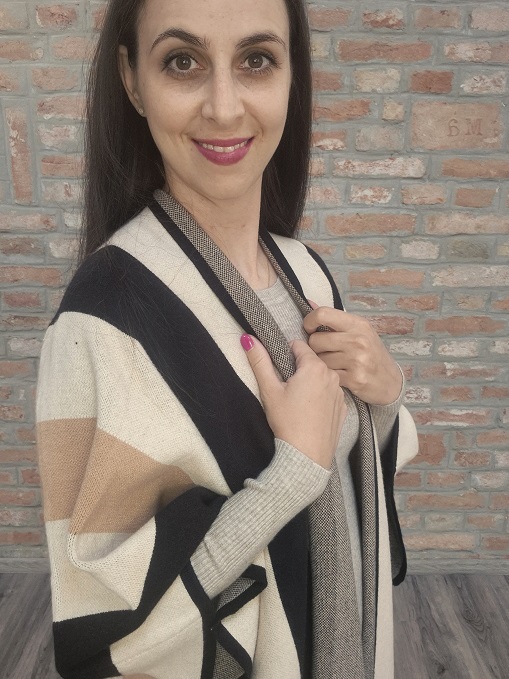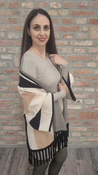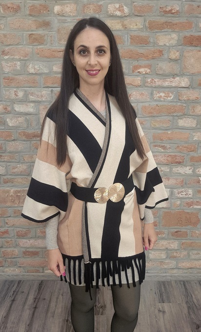 Fekete – barna csíkos , alul rojtos vastag anyagú meleg poncsó/kardigán !