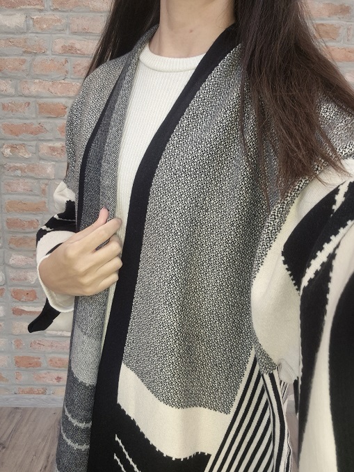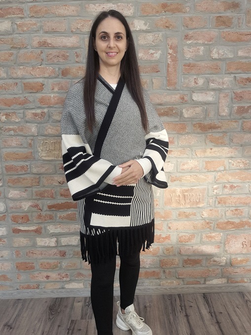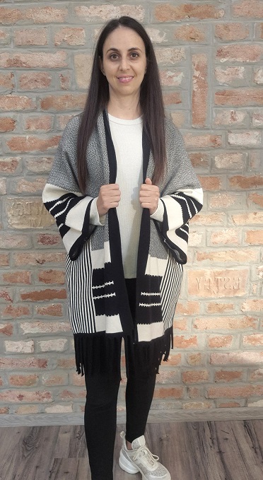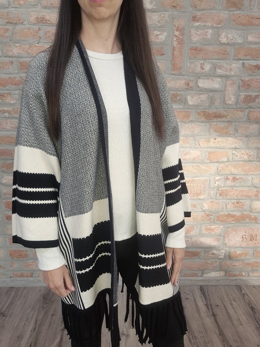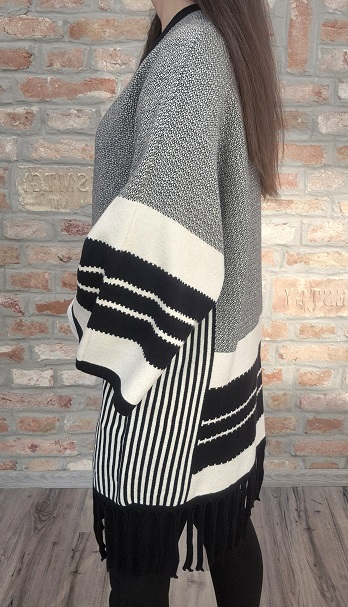 Fekete – fehér csíkos , alul rojtos vastag anyagú meleg poncsó/kardigán !