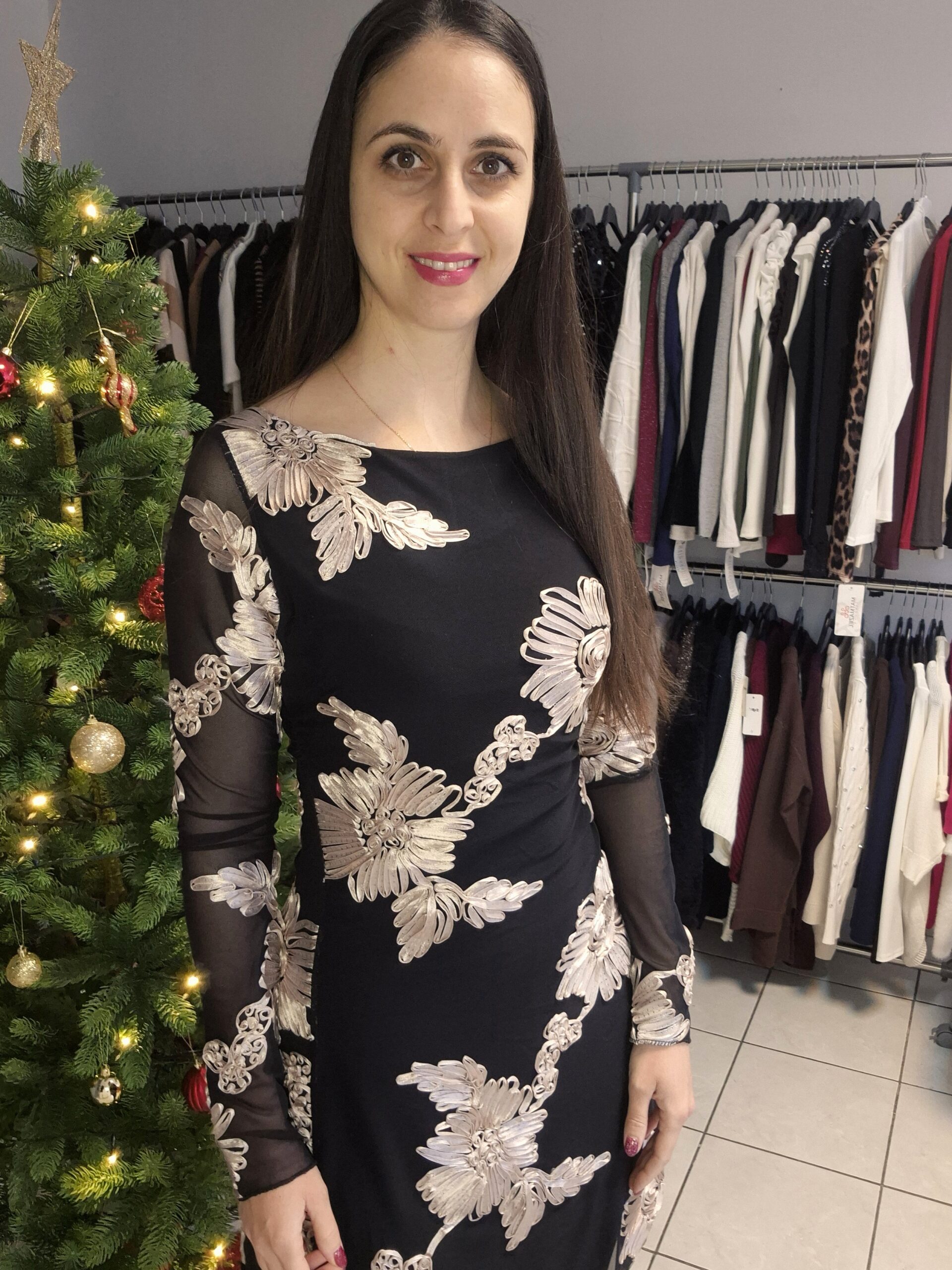 Fekete alapon 3D pezsgő színű virág díszek. Ujja necc anyagból készült!