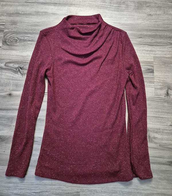 Bordó , ezüst csillogós , bordázott , rugalmas , finom kötött , vastagabb anyagú felső , Nyaknál ráncolt .