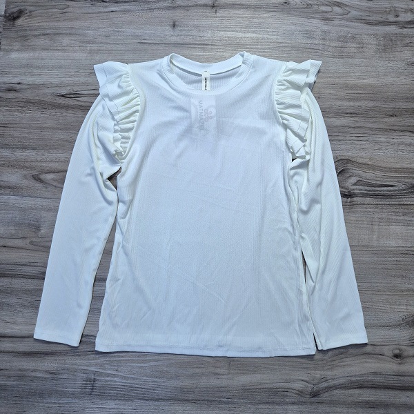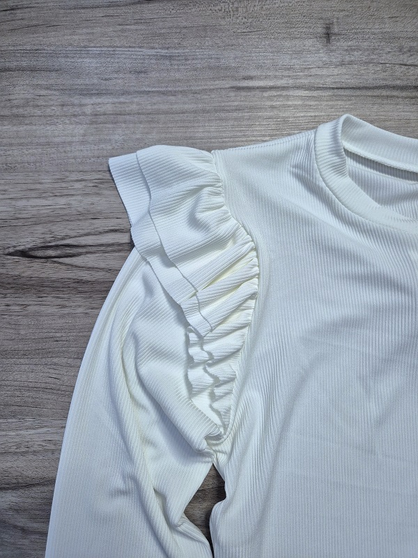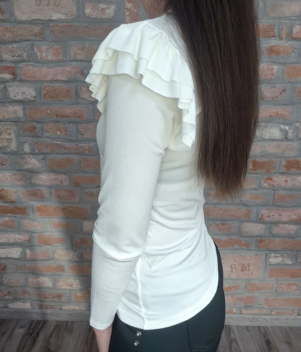 Fehér bordázott rugalmas anyagú , fodros vállú felső!