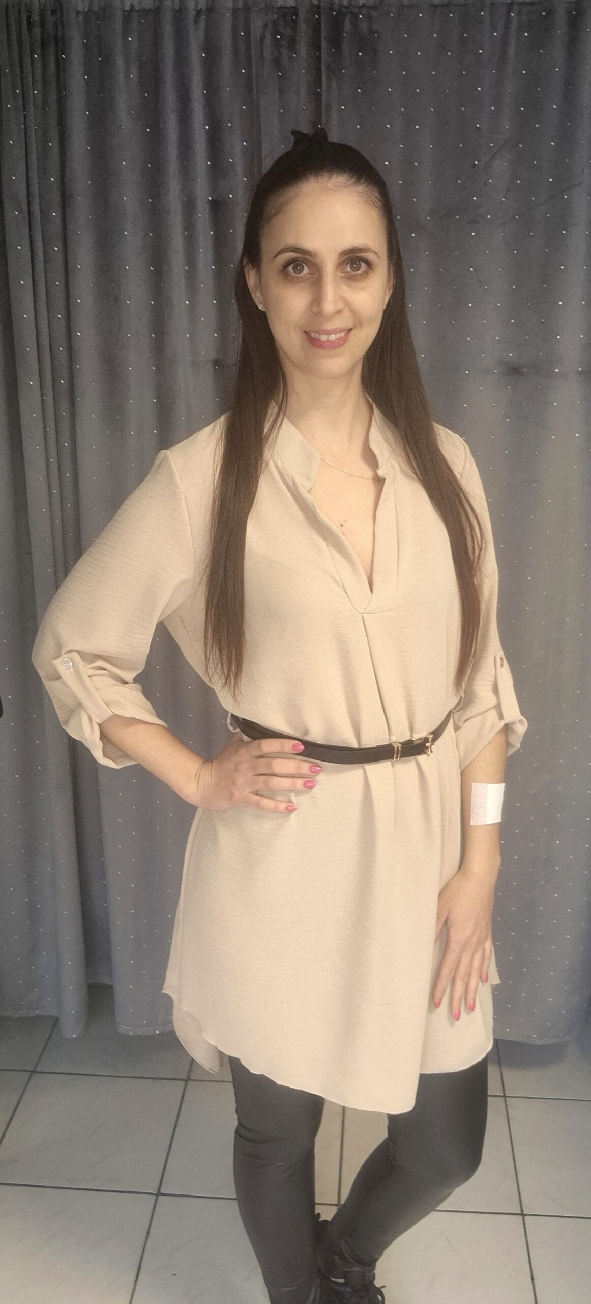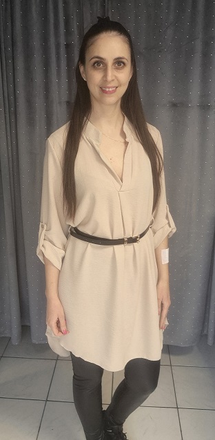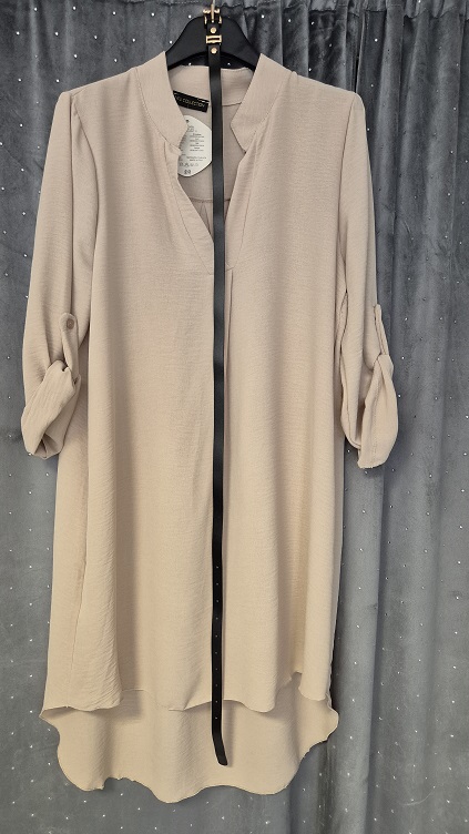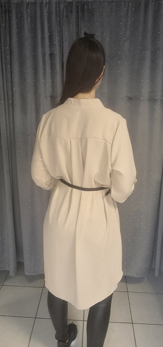 V nyakú , laza fazonú , hátul hosszabb csinos ruha , ajándék övvel! Bézs színű!
