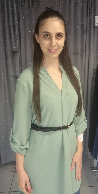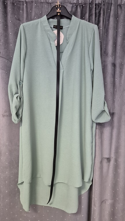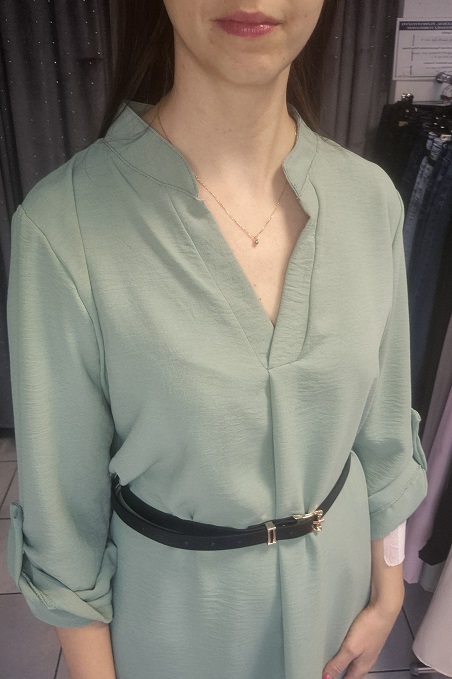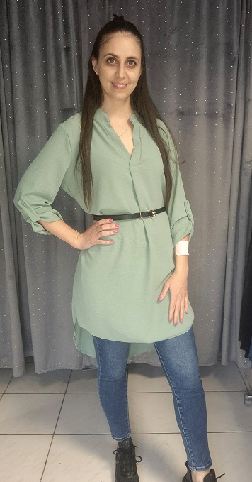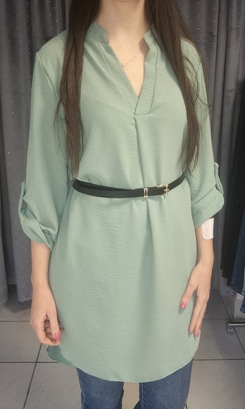 V nyakú , laza fazonú , hátul hosszabb csinos ruha , ajándék övvel! Menta zöld színű!