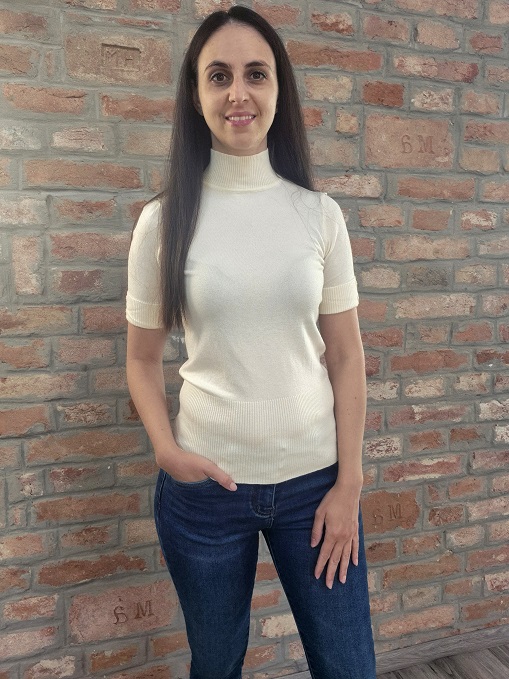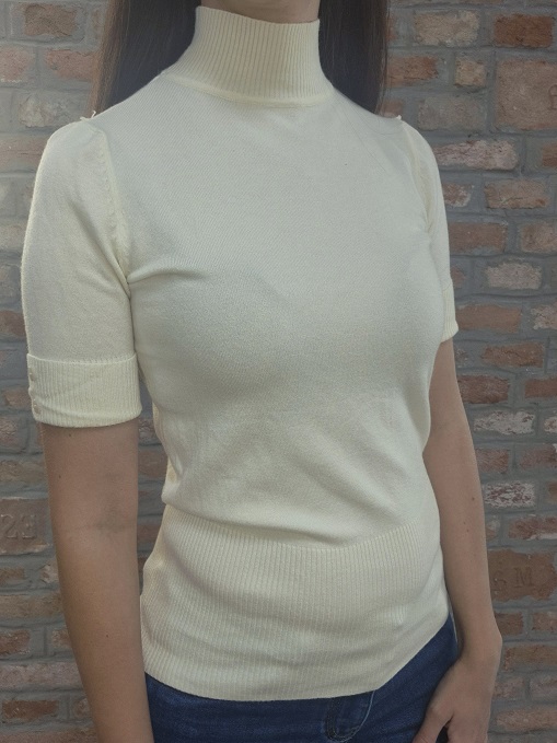 Vanília színű finom puha anyagú, garbós, finom kötött, rövid ujjú, ujján díszgombos felső !